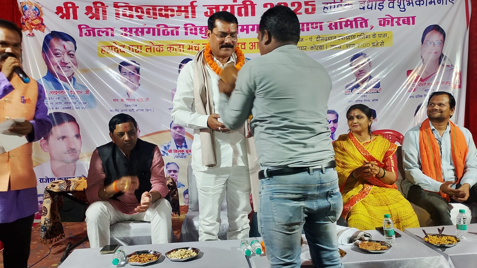 कोरबा । देवशिल्पी भगवान विश्वकर्मा की जयंती के अवसर पर जिला असंगठित विद्युत कामगार कल्याण समिति कोरबा द्वारा घंटाघर के पास देवशिल्पी भगवान विश्वकर्मा जी की प्रतिमा स्थापना कर कार्यक्रम का आयोजन किया गया था जिसमें पूरे विधिविधान के साथ पूजा अर्चना की गई। साथ ही इस कार्यक्रम में भजन संध्या का भी आयोजन किया गया था जिसमे भाजपा जिलाध्यक्ष श्री गोपाल मोदी जी, सादर आमंत्रित किए गए थे।