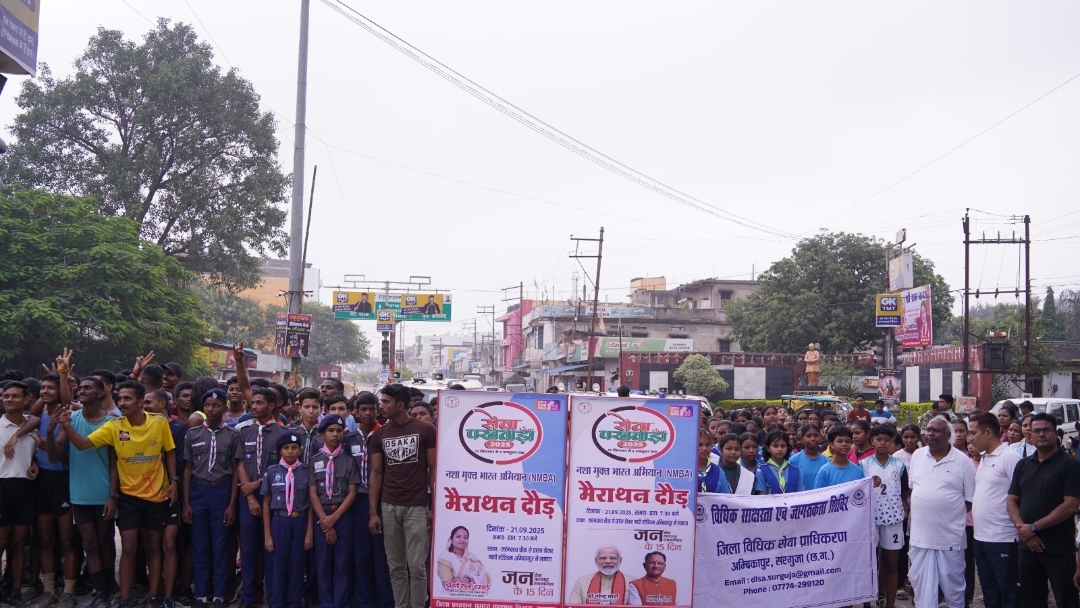 अम्बिकापुर / सेवा पखवाड़ा 2025 के अंतर्गत जिला प्रशासन एवं समाज कल्याण विभाग द्वारा नशा मुक्त भारत अभियान थीम पर जन-जागरूकता हेतु आज मिनी मैराथन दौड़ का आयोजन किया गया। इस दौड़ को सांसद श्री चिंतामणि महाराज एवं नगर पालिक निगम महापौर श्रीमती मंजूषा भगत ने लरंग साय चौक से हरी झंडी दिखाकर रवाना किया।