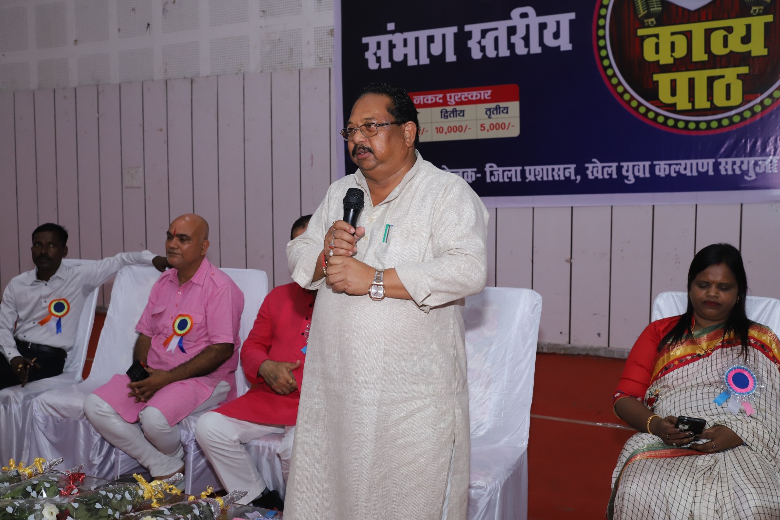 कार्यक्रम में सहायक संचालक खेल एवं युवा कल्याण श्री राम कुमार सिंह के द्वारा प्रतिवेदन प्रस्तुत किया गया। इस दौरान विधायक श्री प्रबोध मिंज ने कहा कि प्रतियोगिता का उद्देश्य युवाओं में साहित्यिक एवं सांस्कृतिक चेतना का विकास करना तथा उनकी अभिव्यक्ति को प्रोत्साहित करना है। उन्होंने समस्त प्रतिभागियों को प्रतियोगिता के लिए शुभकामनाएं दीं। राज्य युवा आयोग के अध्यक्ष श्री विश्व विजय सिंह तोमर ने प्रतिभागियों का उत्साहवर्धन करते हुए बताया कि 04 अक्टूबर 2025 को संभाग से चयनित प्रथम तीन प्रतिभागी राज्य स्तरीय प्रतियोगिता रायपुर में भाग लेंगे। जहाँ पर प्रथम, द्वितीय एवं तृतीय स्थान प्राप्त प्रतिभागियों को क्रमशः 50 हजार, 30 हजार एवं 20 हजार नकद पुरस्कार प्रदान किया जाएगा साथ ही राष्ट्रीय कवियों के साथ मंच पर काव्य-पाठ करने का अवसर भी दिया जाएगा।